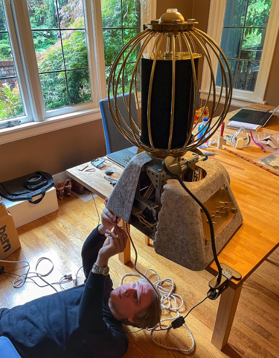 If ‘andotrope’ sounds unfamiliar, that’s because it is a word Mike coined, having almost by chance ended up creating a new form of display. His hologram-like display sits inside a spherical cage constructed from around 12m (40ft) of 6mm brass tube. “It doesn’t quite meet the definition of a zoetrope, and because I couldn’t find anyone else who successfully pulled this off before, I’m calling any display you could build that’s similar to this by the generic term ‘andotrope’”.
