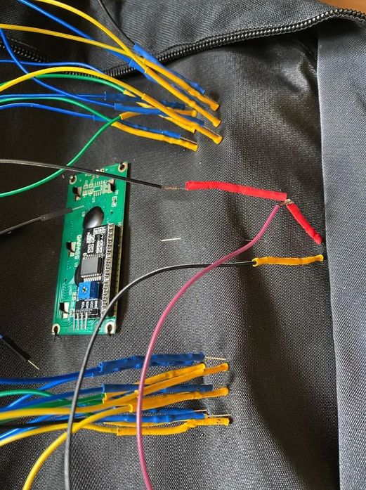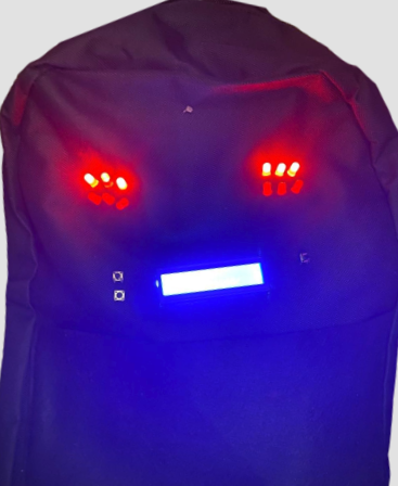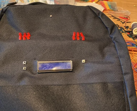All of the electronics were hand-soldered on printed PCBs; Kato warns that you may want to order pre-soldered PCBs online if you’d like to skip this tedious part of the build process. They popped the little red lights through the front flap of the backpack and wired them up behind the scenes, and sewed the LCD screen onto the backpack. This displays the device’s IP address, though it doesn’t show up very well on the photo below.