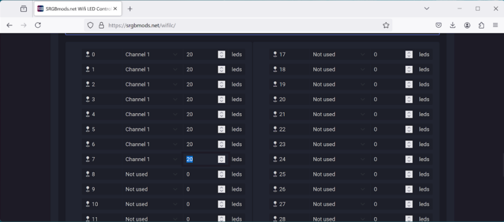 On this page, you can select which GPIO pins are used for outputs and how many LEDs are on each pin. The GPIO pins have to be sequential. We went for GPIOs 0–7. There’s not a fixed limit on the number of LEDs on each pin, though you will run out of RAM at some point. The more LEDs, the slower the updates are, so we’d recommend limiting it to about 100 or so per pin.