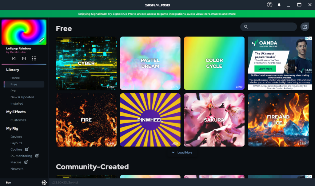 Go to Library > Free in the left-hand side, and you should see the options. Click on an option to download it and you should then see it playing at the top of the left-hand pane. It should also start displaying on the LEDs at this point.