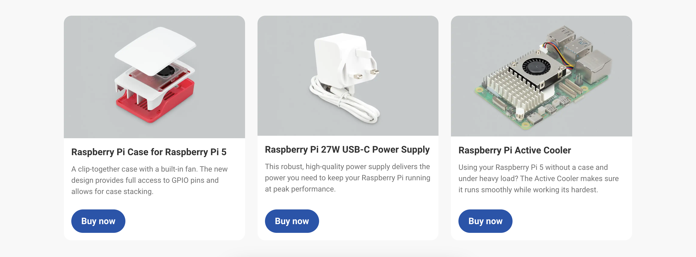 If you’ve received, say, a Raspberry Pi 5 or 500 on its own and have no idea what you need to plug it in, the product pages on raspberrypi.com often feature sensible suggestions for additional items you might need.