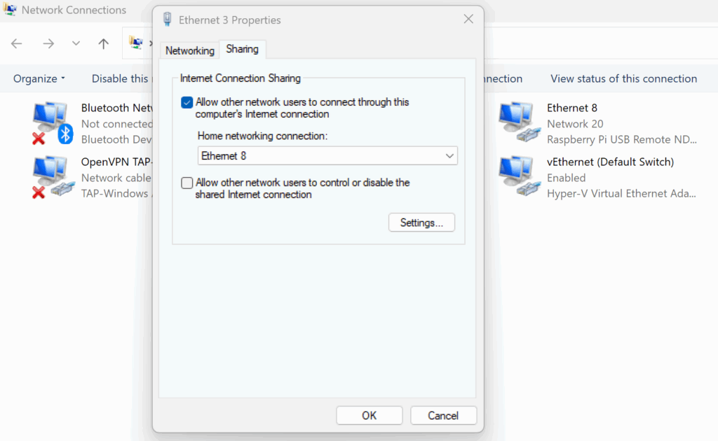 If ICS is enabled for the Raspberry Pi’s adapter while the Raspberry Pi is not connected, Windows may bind its DHCP service to another interface (such as a Hyper-V adapter). In that case, the Raspberry Pi interface may show as shared but will not receive a DHCP lease. To fix this, fully disable ICS on all adapters you shared the network from, plug in the Raspberry Pi, and then re-enable ICS.