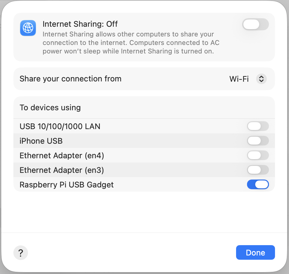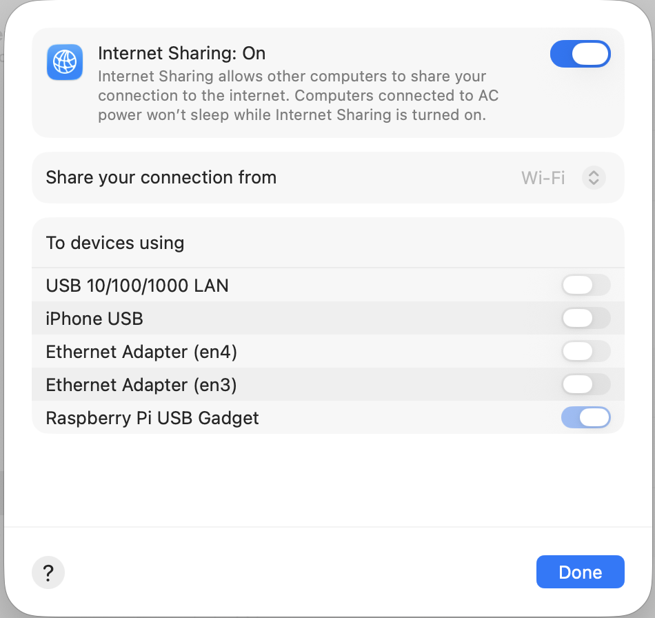→ The Raspberry Pi USB Gadget interface as the target to share to - Save and toggle ‘Internet Sharing’ on