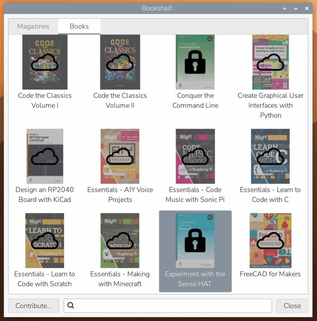 In order to unlock these titles, you will need to set up a contributor account. Click the ‘Contribute…’ button at the bottom left of the window to open the contributor pages on the Raspberry Pi website.