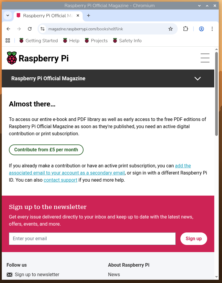 We’ll get to the second way in a bit, but first, anyone who makes a contribution of £5/€5/$5 a month is eligible to download not only PDFs from our books website but also ePUB versions, which are more suitable for e-book readers. Recurring contributors will also get early access to Raspberry Pi Official Magazine PDFs, three weeks before they are made freely available to all. If you signed up for early access to the magazine at £3/€3/$3, you’ll have access to both book and magazine PDFs at that rate — unless you cancel your recurring contribution.