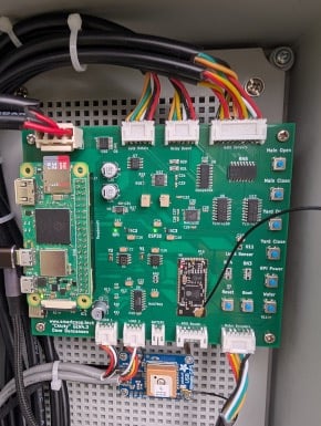 Dave started working on SmartCoop over ten years ago, and the current version contains the fourth generation of his custom-made PCB. With this new design, he could bump the system to use a Raspberry Pi Zero 2 W.